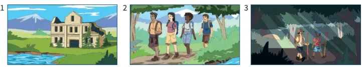 3. We walked through a forest; it was very dark among the trees.