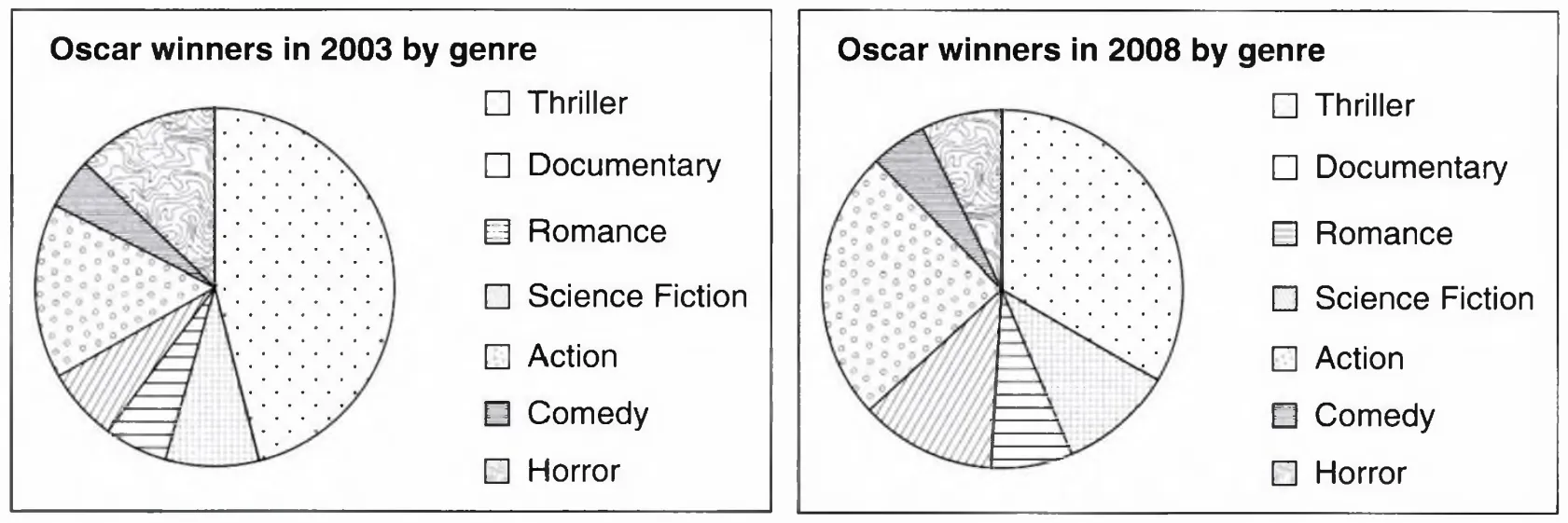 The pie charts below show the share of Oscar winners by film genre for 2003 and 2008. Summarize the information by selecting and reporting the main features, and make comparisons where relevant.