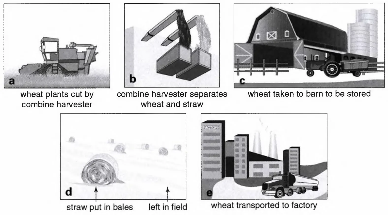 The diagram (show) the process of harvesting wheat. First of all the wheat plants (1) (cut) by a combine harvester. Then the machine (2) . (separate) the wheat from the straw. The wheat (3) (take) to the barn where it (4) (store).The straw (5) . (put) into bales and (6) . (leave) in the field. Finally the wheat is (7) (transport) to factories to be made into food products.