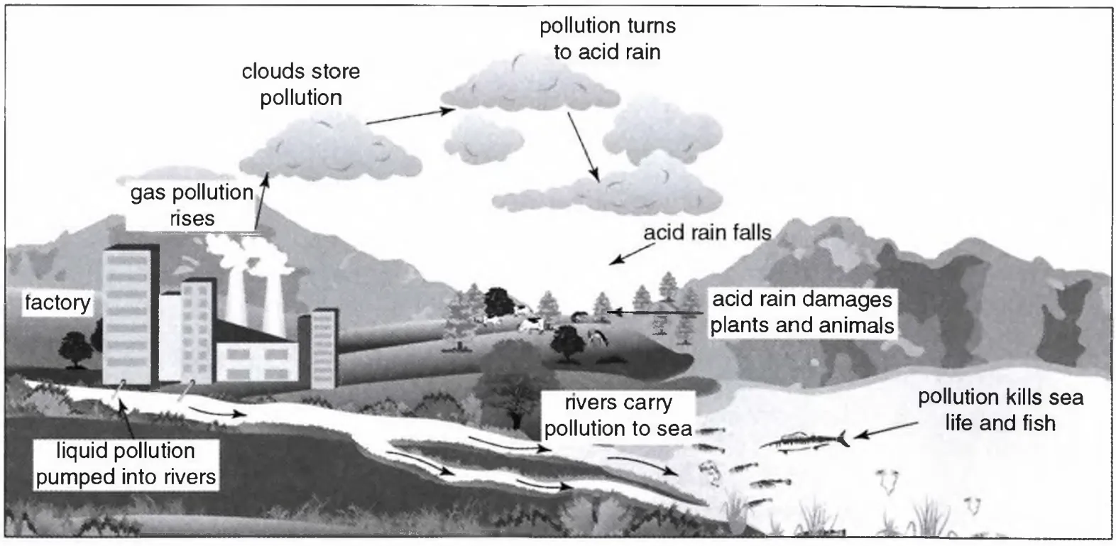 Label: Clouds store pollution / pollution turns to acid rain / acid rain falls.