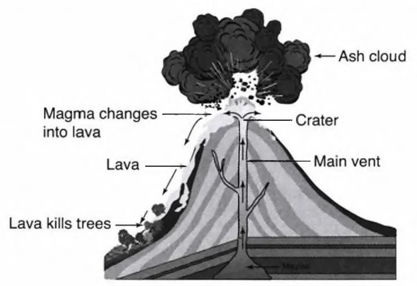 2. magma / erupt from / crater / top / volcano