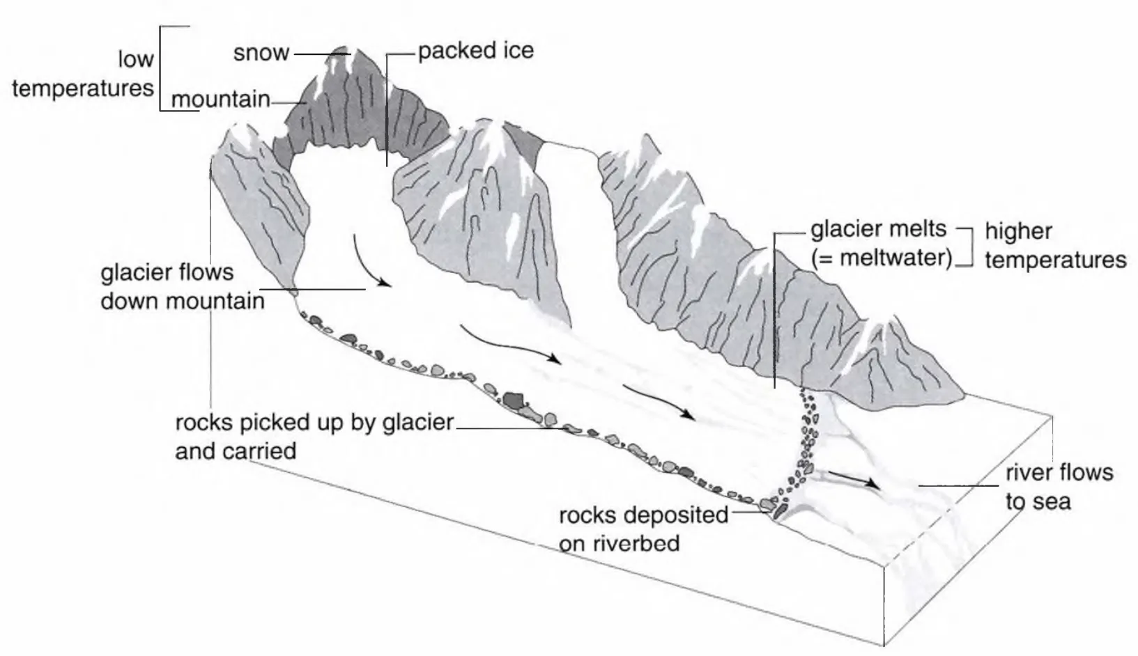 Rocks underneath the glacier are picked up and carried along. When the glacier reaches the bottom of the mountain, it starts to melt. The ice from the glacier is turned into meltwater. Next, this meltwater becomes a river and the rocks from the glacier are deposited on the riverbed. Finally, the river flows to the sea.