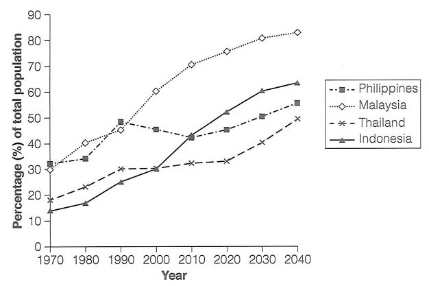 The graph below gives information about the percentage of the population in four Asian countries living in cities from 1970 to 2020, with predictions for 2030 and 2040.