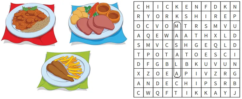 Look at the pictures. Find 10 more words connected with food in the puzzle.