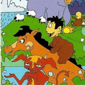 Ivanko went to the lake, sat down, and began to try to make rope out of sand. While he was working, a goblin came up out of the lake. The goblin said, "I will help you if you can carry my horse around the lake more times than I can." The goblin pulled his horse out of the lake, picked it up, and carried it around the lake 3 times. Then Ivanko jumped on the horse and rode it around the lake 20 times.