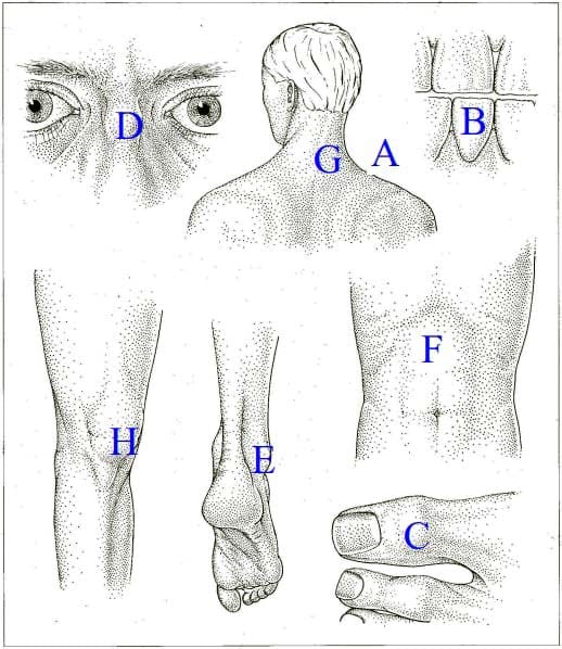 You will hear people describing where they feel pain. Which part of the body are they describing? Number the parts described.