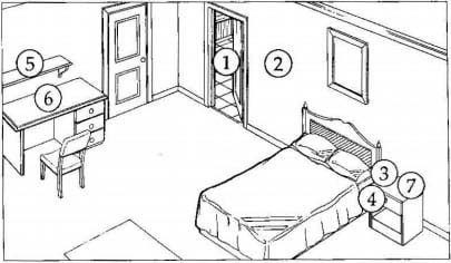 Mrs Keane has just arrived at her hotel. Listen to the porter showing her where things are in her room. Number the correct places in the picture.