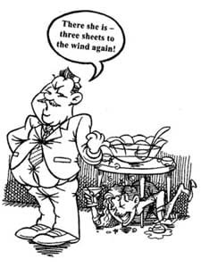 Peter: She drank at work. By five o'clock, she'd be lying under a dining room table, three sheets to the wind. Yesterday, I finally got rid of her.
