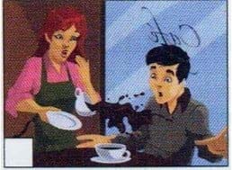 A: No. But I was sitting in a cafe this morning, having coffee. The server walked by with someone else's coffee. She tripped and spilled it all over me! Now I have to go home and change my shirt.