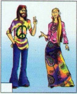 This is the late 60s-early 70s, of course. Look at this woman's long tie-dyed skirt. It's so colorful. The guys wore jeans and T-shirts with peace signs on them! And all the young people had long hair back then.