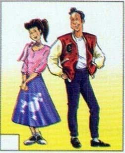 This must be the 1950s, when boys had their hair slicked back and wore high school letterman jackets and tight jeans. I wonder how they ever got into them—or out of them for that matter. The girls wore sweaters, neck scarves, and wide skirts.