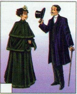 This has to be around 1910. People dressed very formally back then. Men had suits with long jackets and they usually wore black hats. The women wore long dresses and capes. They looked very elegant. |