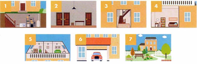 Look at some other places that you find in and around a house. Then, match the names in the box to the pictures.