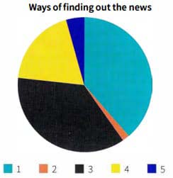 01. The pie chart represents the main way of finding out the news by adults in the UK in 2015. Predict which section of the chart represents TV, radio, print, online and 'not specified'. Explain your predictions to your partner.