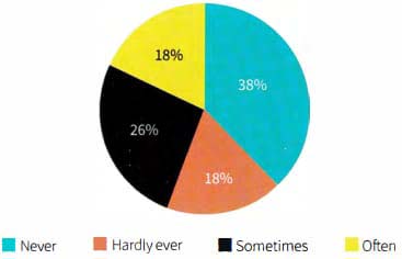 06. The pie chart shows the frequency with which adults in the US find out the news through social media. Describe each section without using the numbers. Use the modifiers in the box where appropriate.