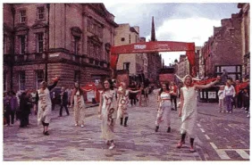 Christopher and I arrived at our hotel in Edinburgh last night. After checking in, we had dinner and explored the city streets. It was really fascinating but we went to bed soon after because we were so tired! Today we went to King's Theater to watch some short plays that are part of the Fringe Festival. People here call it "The Fringe," and it has an awesome variety of shows by all sorts of performing arts groups. A parade of actors greeted us as we walked down the street. They were waving colorful flags, one for each of the theater companies performing at the festival. It was a great way for us to start our festival experience. Christopher wants to hear some bands at the Jazz & Blues Festival, and we hope to see a good film tonight.