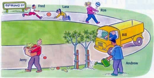 1. Who’s throwing a ball along the street? 2. Who’s dropping fruit along the street? 3. Who's watering trees along the street? 4. Who's driving a truck along the street? 5. Who’s practising football along the street? 6. Who's drawing a line along the street?