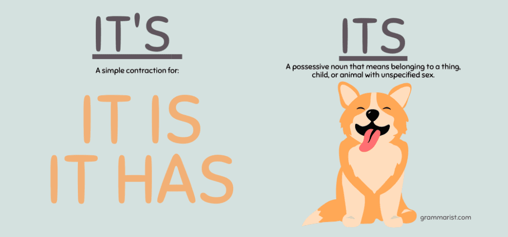 📌 Mẹo: You’re luôn có thể tách thành you are. Nếu thay vào mà câu vẫn đúng thì dùng “you’re”. 6. Its vs. It’s Cũng giống “your/you’re”, “its” và “it’s” phát âm y hệt nhau (/ɪts/). Quy tắc sở hữu trong tiếng Anh thường dùng ’s (John’s car), nhưng với “it” lại ngoại lệ: sở hữu là “its” không có dấu nháy. Điều này khiến người học mặc định thêm dấu nháy cho sở hữu, dẫn đến viết sai.