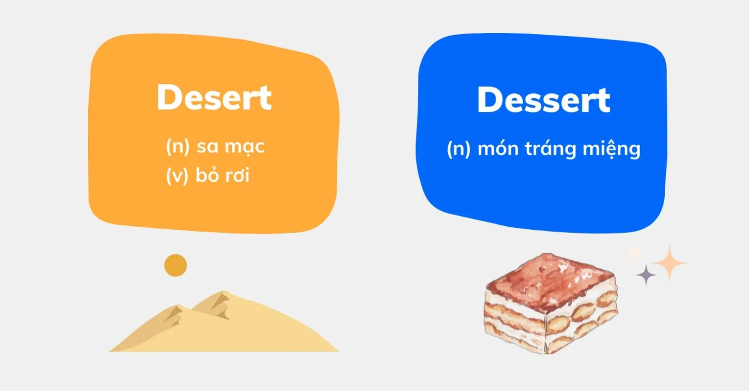 📌 Mẹo: Quiet (yên tĩnh) có “et” giống “yên”. Quite (khá) có “e” cuối – khá “e” dễ nhầm. 9. Desert vs. Dessert Chỉ khác nhau số lượng chữ “s” (1 hay 2) nhưng nghĩa hoàn toàn khác biệt: sa mạc – món tráng miệng. “Desert” còn có cách phát âm và nghĩa khác ( /dɪˈzɜːt/ – bỏ rơi) khiến càng rối. Vì trọng âm thay đổi, người học không chú ý đến trọng âm khi viết nên rất dễ gõ ngược.