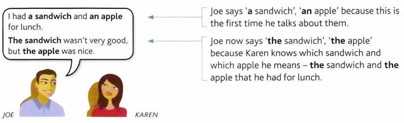 Compare a and the in these examples:  • A man and a woman were sitting opposite me. The man was American, but I think the woman was British. • When we were on holiday, we stayed at a hotel. Sometimes we ate at the hotel and sometimes we went to a restaurant. |