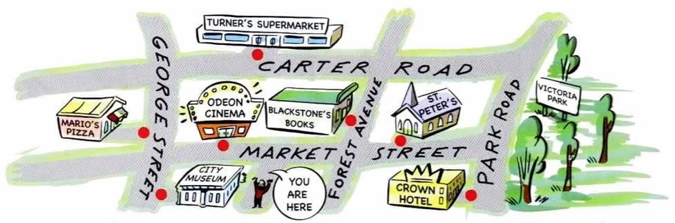 Use the map to answer the questions. Write the name of the place and the street it is in. Use