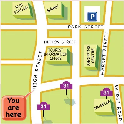 Look at the map in vocabulary section. How do you get from the tourist information office to the