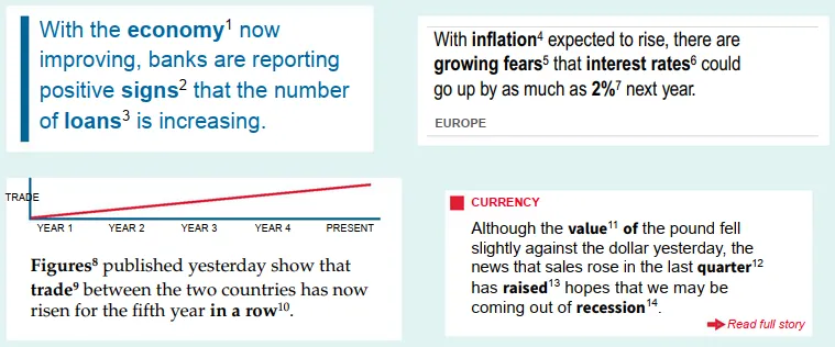 When sales or prices rise / go up / increase, they can do it in different ways: