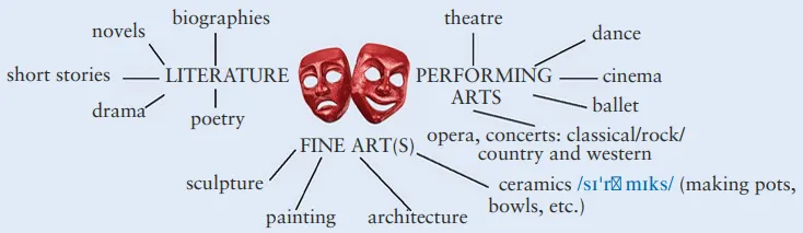 - The arts (plural) covers everything in the diagram above. Art (singular, uncountable) usually means fine art, but can also refer to technique and creativity.