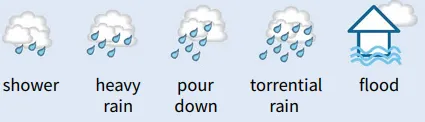 shower (noun) → heavy rain → pour down (verb) / downpour (noun) → torrential rain → flood