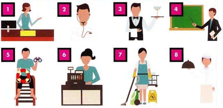 waiter chef lifeguard shop assistant receptionist teacher cleaner doctor