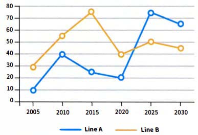 After it (1) from 30% in (2) to (3) in 2010, line B (4) up by another 20% between 2010 and 2015. This was its highest point. It started to (5) in 2015, going (6) to 40% in (7) . It will (8) to 50% in 2025, and then will (9) to 45% in 2030.