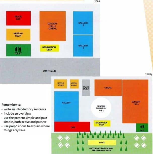 Inside, a central exhibition area was created. The information desk was moved to the front of the central area. In the past there were two galleries but now there is only one; however, a drama studio was built. In 2005 the concert hall and cinema were in the same space, whereas now they are separate. In addition, an extra meeting room was constructed. The toilets moved to the opposite side of the Centre.