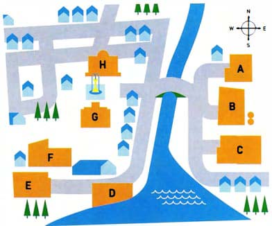 Well, I live in a small town in the north of my country. It has quite a few interesting places to visit. For example, in the centre of town, on the north side of the square we have the historic town hall, which was built in 1895. In front of it, there’s a beautiful fountain. Opposite the town hall there’s the library. Then if you go over the bridge, we have the art gallery, a big modern building, which often has interesting exhibitions. The art gallery is actually between the cinema (to the north) and a big shopping mall, where I often meet up with my friends.