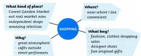 05. Look at two types of notes about shopping, based on Daniel's talk. One uses a mindmap and the other uses bullet points. Choose the one you like best and add to the notes. Change the ones that are not true for you.