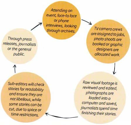 Overall, the diagram shows how news is created in five simple steps. Many people are involved in the process, from journalists to photographers.