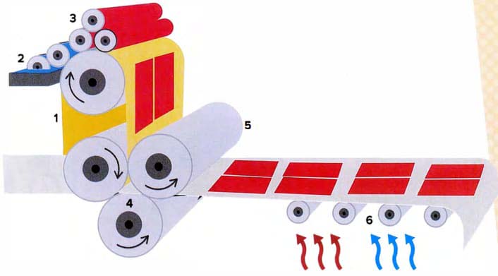 First, the plate is passed through dampening rollers, which provide a mixture of water and chemicals. This is to dampen the non-image areas. Secondly, the plate passes through a set of ink rollers, in order for the ink to stick to the image area. Thirdly, the plate goes through the blanket cylinder. This is to squeeze out the water and the inked image area is picked up. Finally, the plate passes through the impression cylinder. The paper then runs between the impression cylinder and blanket cylinder, pressing the image onto the paper. After that, the paper is dried with hot and cold air and put on the delivery pile.