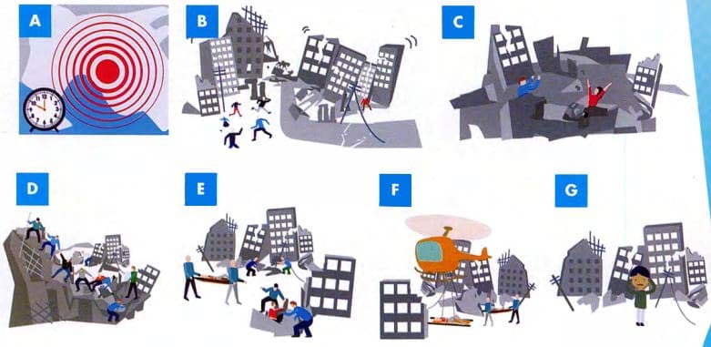 Look at this picture sequence about an earthquake. Retell the story in your own words.
