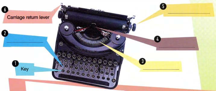 When you take your finger off the key, a spring makes the hammer move back to where it was before. At the same time, the carriage, which is the cylinder-shaped part at the top where the paper is held, moves to the left. You can therefore continue to write the word that you want. When the carriage gets to the end of a line you hear a bell. When you hear the bell, you press the carriage return lever on the left-hand side of the typewriter, which moves the paper up, so that you can continue writing on a new line.