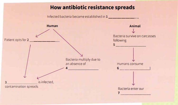 Although their resistance to antibiotics has been built up over a long period of time, bacteria actually replicate extraordinarily quickly, and any resistance developed is also duplicated as they divide. In addition, those bacteria carrying resistance genes happen to spread those genes further via 'horizontal gene transfer', a process whereby one bacterium passes on the resistance gene from another without even needing to be its parent. What makes the spread of these strains more difficult to control is that it occurs in a cyclical process. In the case of humans, when a person becomes infected and the resistant bacteria set up home in the gut, the sufferer has two choices: look for help or stay at home. In seeking medical assistance, whether through an appointment to visit their local doctor, or taking themselves to hospital, they contaminate other patients, later to be discharged and sent home. The resistant bacteria then spread out into the local community. This is also the end result if the infected person decides not to seek any medical assistance at all: they keep the bacteria at home and allow them to breed without treatment.