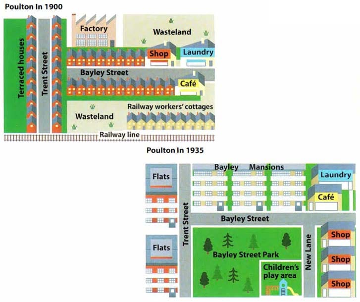 1. The maps show that in 1900 there were many terraced houses, some railway workers' cottages, a factory, cafe, small shop, a railway line and some wasteland. In 1935, this situation had changed and had become a residential area with shops and a park.