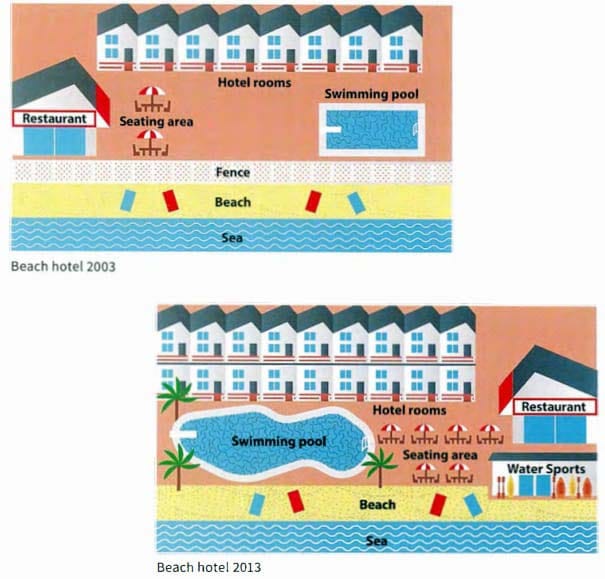 12. Look at the two maps of a beach hotel at different times. Make notes on the key changes in the following areas: