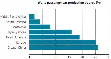 that the regions pf Greater China and Europe lead the way , the manufacture of passenger cars, with 26% and 25% . ,very few cars are produced in the Middle East and Africa: just 2% originate from that area.