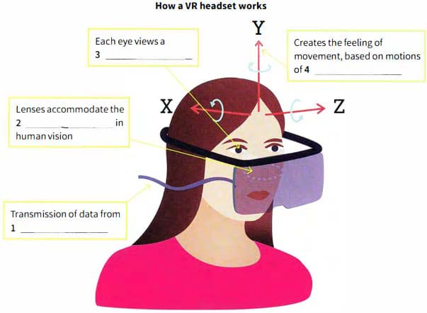 C These lenses enable two 20 images of the display to be viewed, thus creating a tailored picture for each eye. These combine to create the illusion of 'real life' in 3D. The HMD also uses 'head tracking‘, a system that follows the principle of aircraft flight, tracking three measurements known as pitch, yaw and roll (or movement along the x, y and z axes). it means that when the user tilts their head up, down, or to the Side, VR follows these motions and allows them to ‘see' all around them.