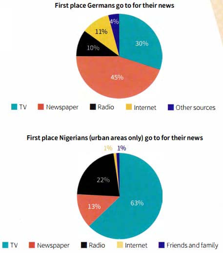 The pie charts represent which sources the citizens of two countries, Germany and Nigeria, turn to first in order to access the news. It should be noted that the figures for Nigeria do not include figures for rural areas of the country. Overall, it is clear from the data that the two countries have vastly different tendencies when it comes to news sources.