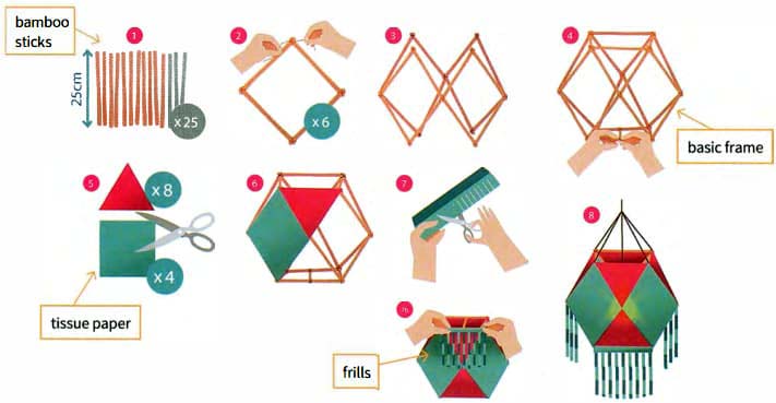 03. The diagram shows the process of makingWesak lanterns, which Sri Lankans do to celebrate the festival ofWesak in May each year. With a partner, make a list of verbs, nouns and adjectives you could use in describing this process.