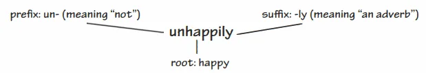A prefix comes at the beginning of a word, a suffix comes at the end of a word, and the root is the main part