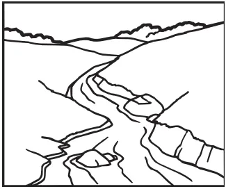 Snow falls on mountains. Then it melts. The water runs down the mountain. Now, it